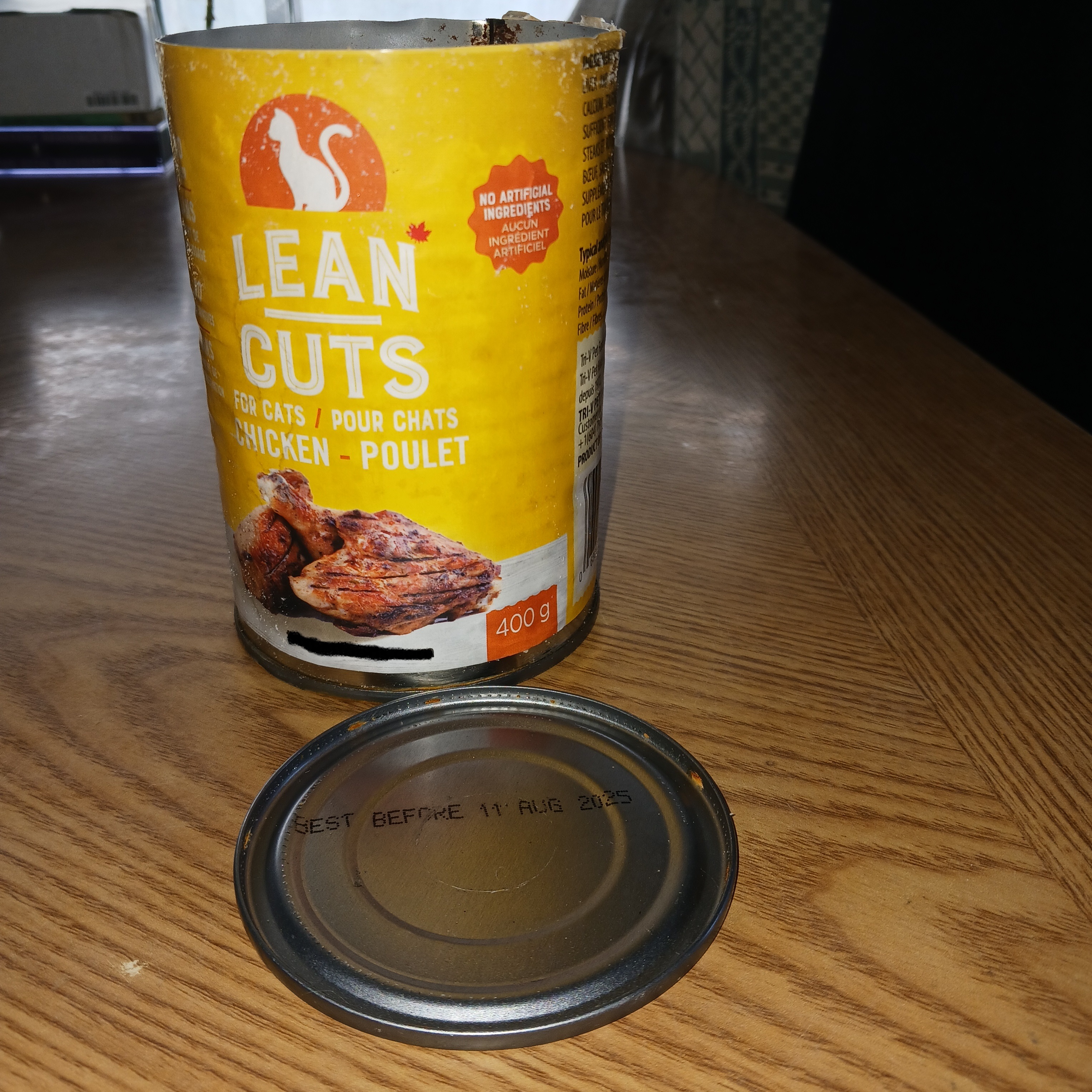During November of 2023, I encountered another form of spoiled cat food. In this case, I found the suspect can amongst an order of 12 cans made by the same pet food manufacturer purchased at a local retail store. The first thing I noticed was the outside of the can felt greasy. So, I wiped the can down thinking that perhaps something had been spilled on it at some point in its' travels. Wiping the can down, though, did not help the product wrapper to dry. The wrapper remained greasy looking and I could see that the paper had wrinkled and looked wet. The condition of the paper wrapper made it so that I could easily see the ribs of the tin underneath the wrapper. I didn't think much more about this particular can of food and put it in my cupboard.